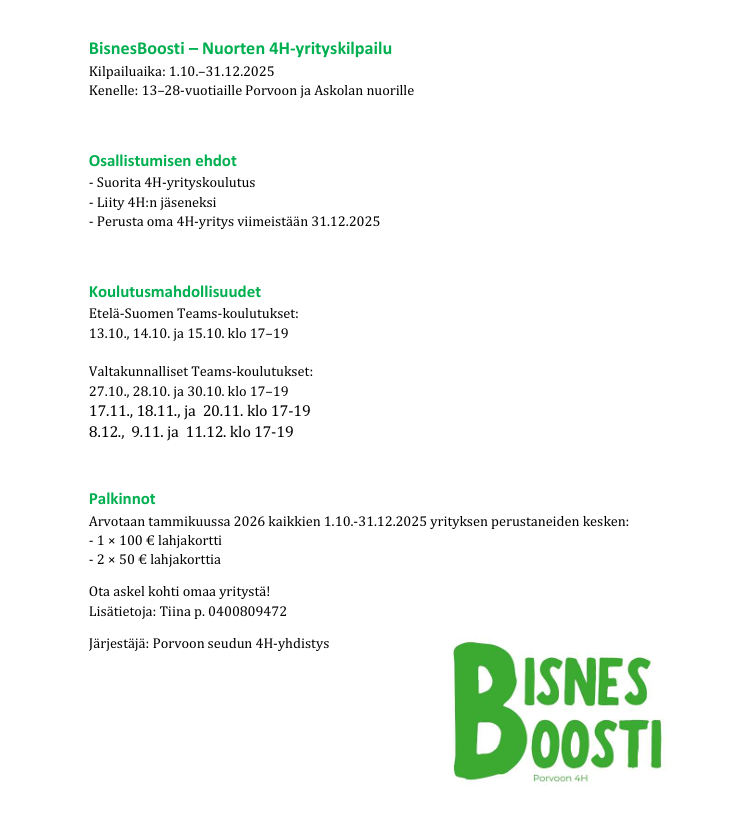 Kiinnostaako oman yrityksen perustaminen? 4H-yhdistys järjestää kevään aikana kolme yrityskoulutusta, joissa opit kaikki tarvittavat taidot oman 4H-yrityksen pyörittämiseen. Koulutukset järjestetään…